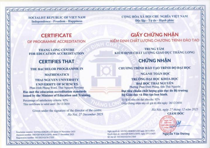 Ngày 18/01/2026, CTĐT Đại học ngành Toán học và CTĐT trình độ Thạc sĩ ngành Toán ứng dụng của Khoa Toán – Tin vinh dự được nhận Giấy chứng nhận kiểm định chất lượng chương trình đào tạo.